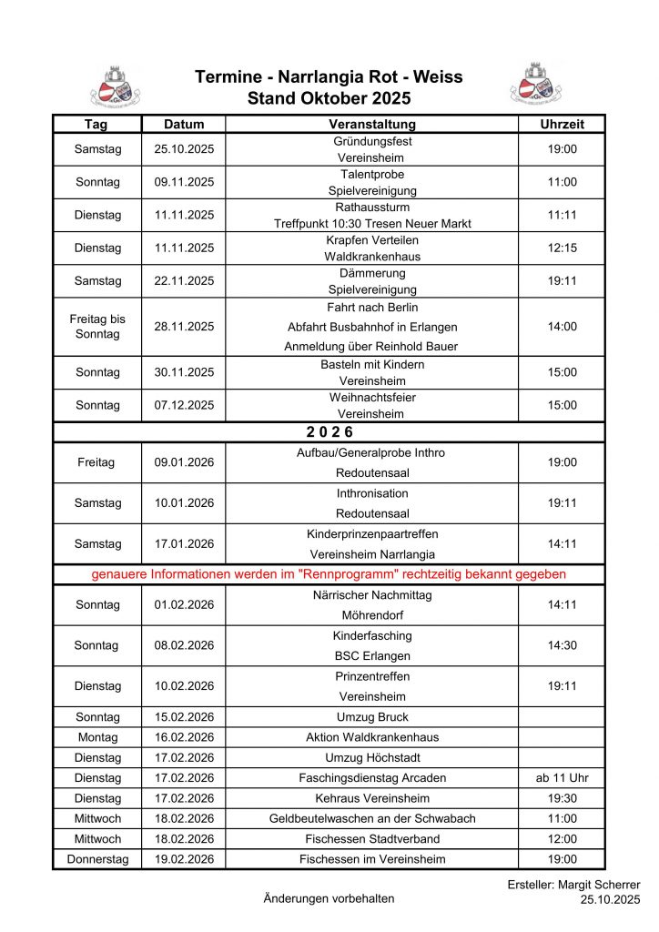 Aktuelle Termine der Narrlangia Rot – Weiss